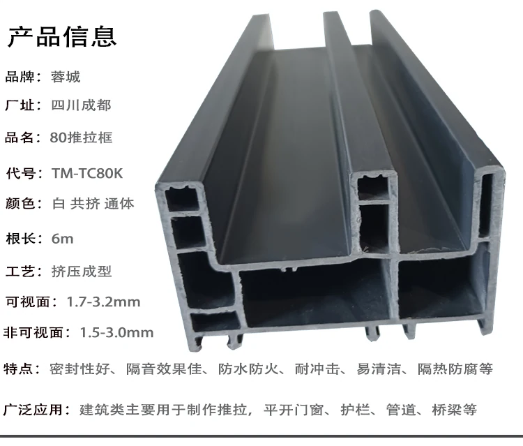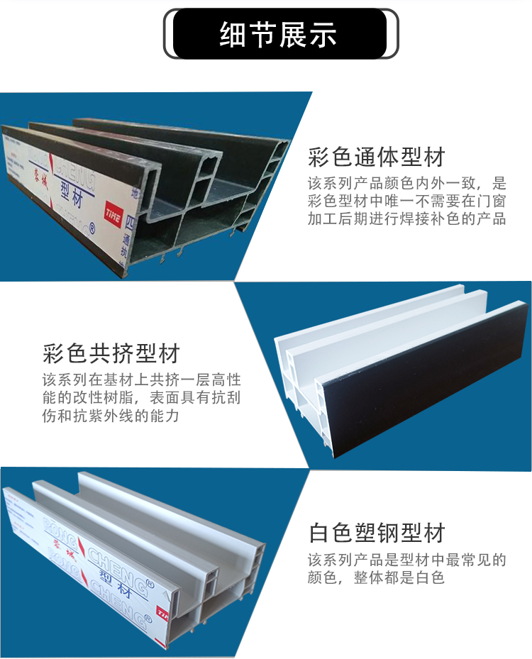 四川太萌塑鋼門窗型材廠家生產的80推拉框顏色有:白色、單、雙面共擠、通體彩色、型材壁厚多種。
